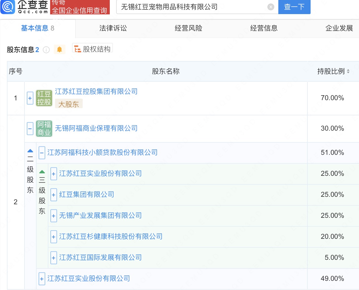 近日投牛策略,无锡红豆宠物用品科技有限公司成立,法定代表人为刘建松,经营范围包含:宠物食品及用品零售;宠物食品及用品批发;可穿戴智能设备销售等。企查查股权穿透显示,该公司由江苏红豆控股集团有限公司等共同持股。