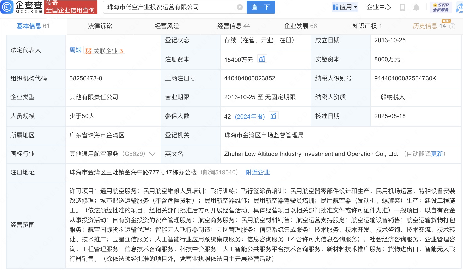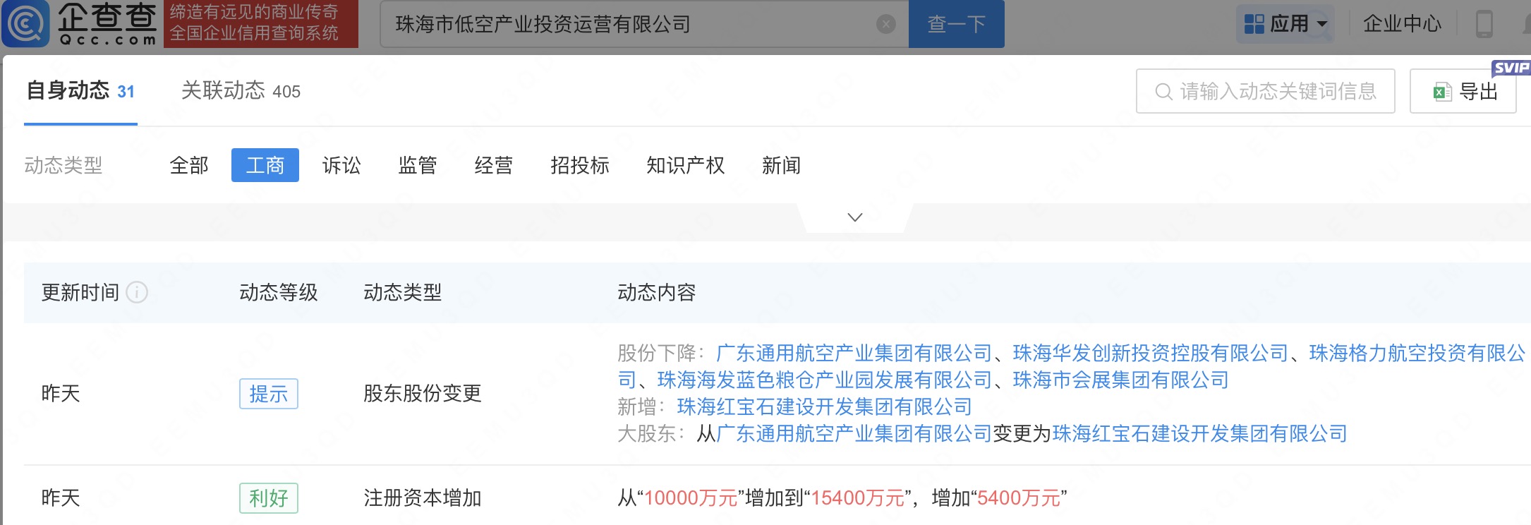 近日,珠海市低空产业投资运营有限公司发生工商变更,新增珠海红宝石建设开发集团有限公司为股东,注册资本由1亿人民币增至1.54亿人民币,同时,部分主要人员也发生变更。企查查信息显示,该公司成立于2013年昊天优配,法定代表人为周斌,经营范围含通用航空服务、民用航空维修人员培训、飞行训练、民用机场运营等。