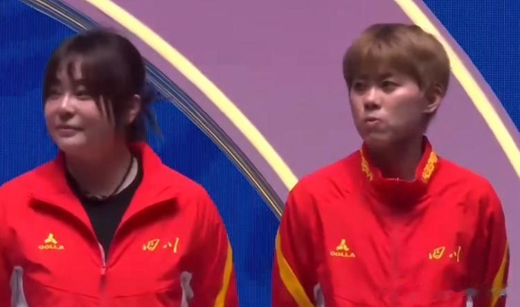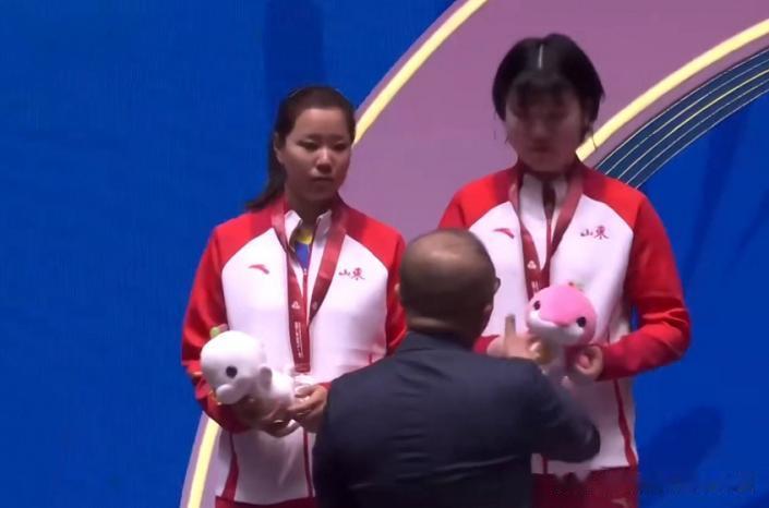 获得女单铜牌的高雨轩撅着嘴,似乎有点不开心。不知她平时就是这个表情,还是因为没有达到预期的目标,心里不开心。她的教练倒是面带微笑,显得很开心。教练员也能跟队员一起登台领奖,确实是一件值得开心的事情,也是一段美好的回忆。