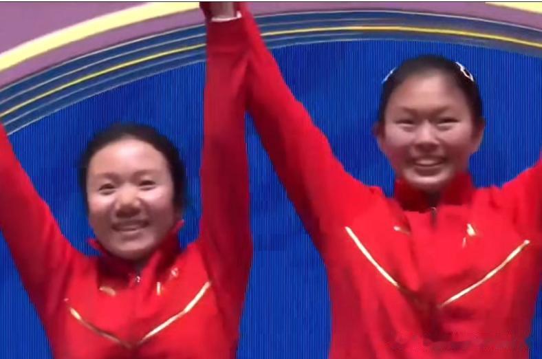 夺得女单金牌的姚睿轩与教练举起双手,笑容灿烂,非常兴奋和自豪。