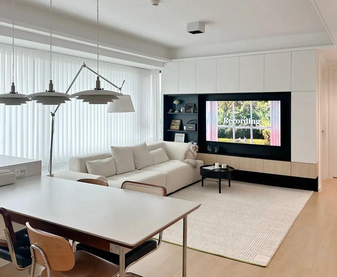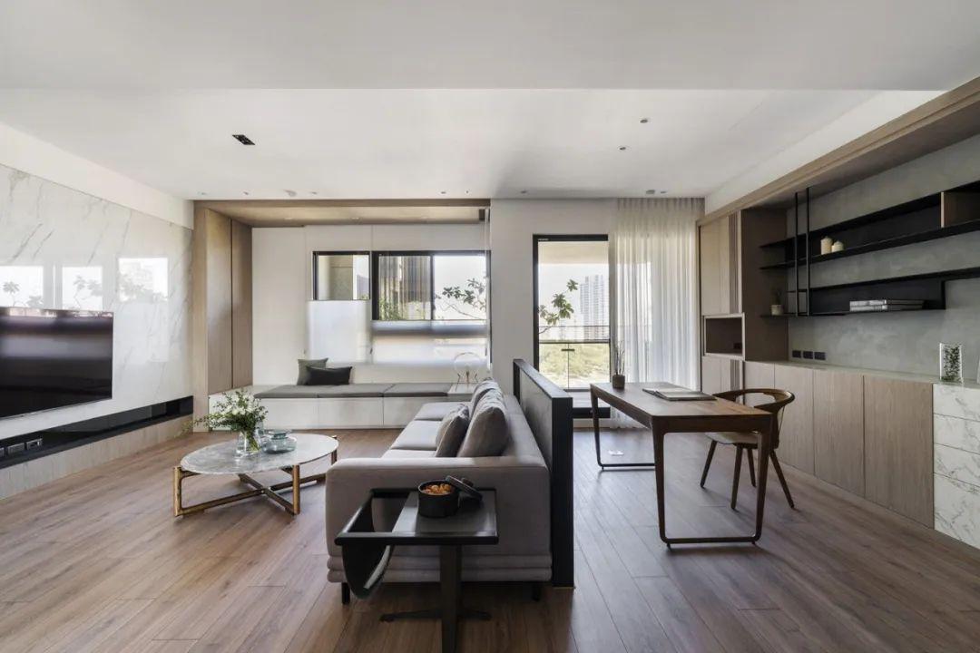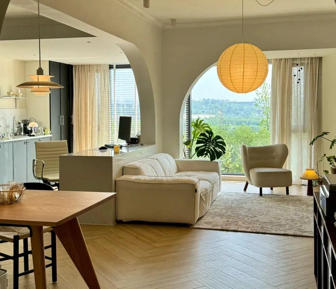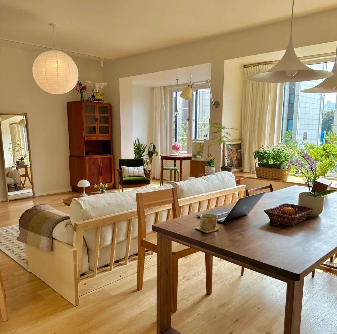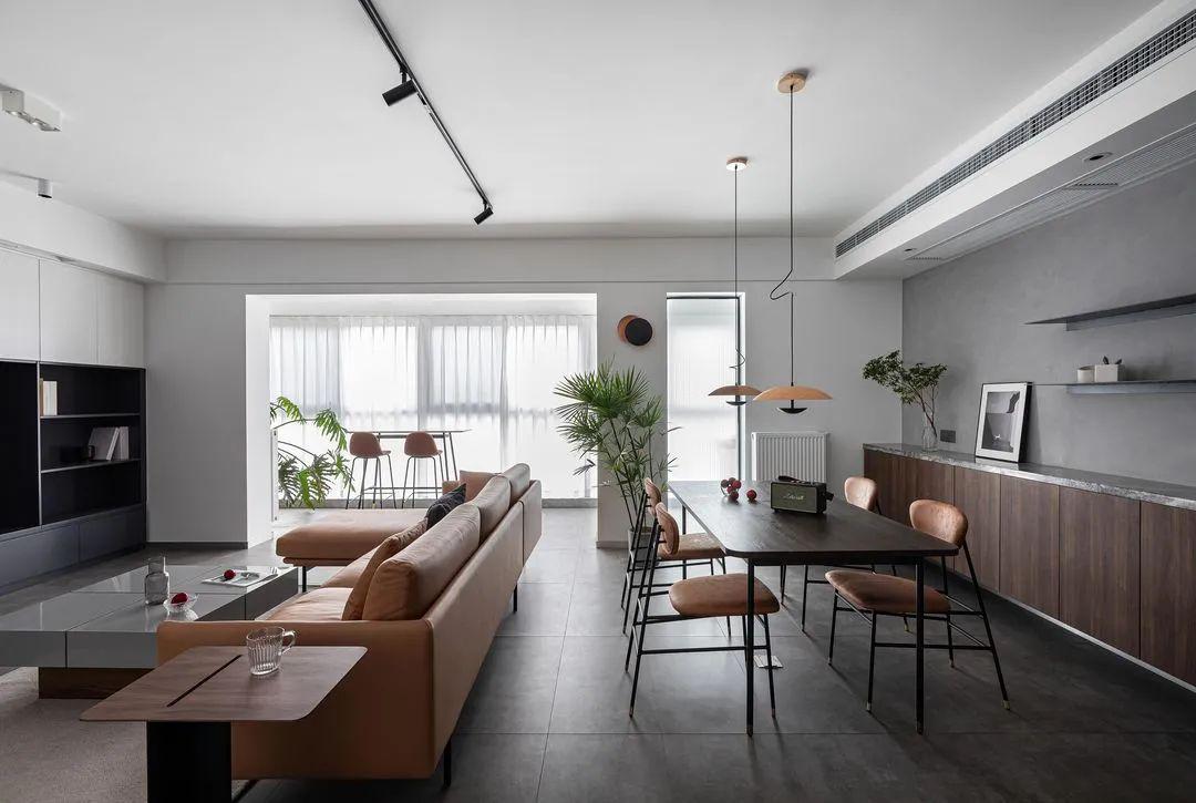 把餐桌放在沙发旁边,两个区域既相连又相对独立。可以用不同的灯、地毯或墙面装饰来区分,整体看起来和谐又不乱。